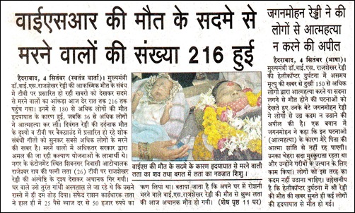 यो स्वर्गीय वाइएसआरको आलोचना नभएर , उनी पनि बाँकि नेता जस्तै थिए भन्न मात्र खोजिएको सन्दर्भ हो । १९८४ तिर आँफुले मुख्यमन्त्री नपाएको झोकमा, पार्टीमा बगावत गराउने उनी , पदयात्रा दलित, किसान , माइनोरिटी कार्डका कुशल खेलाडी हुन पुगे र कालान्तरमा राजनीतिमा सफल बने ।उनी कांग्रेस शासित भारतीय राज्यहरू मध्येका उनी सबैभन्दा लोकप्रिय मुख्यमन्त्री थिए, र एउटा सफल राजनितिक नेताको असामयिक मृत्यूमा जनता शोकाकूल बन्नु सर्वथा उचित भए पनि , सबै कुरा त्यागेर मर्न तयार हुनु भनेको पागलपनको हदभन्दा केही हैन । यस्तो पागलपन अन्यत्र पनि होला तर , भारत र दक्षिनतिर अज बढी छ । कमसेकम हामी नेपाली भने यस्तो कुरामा धेरै सभ्य छौँ , हत्तपत्त मर्दैनौँ ।